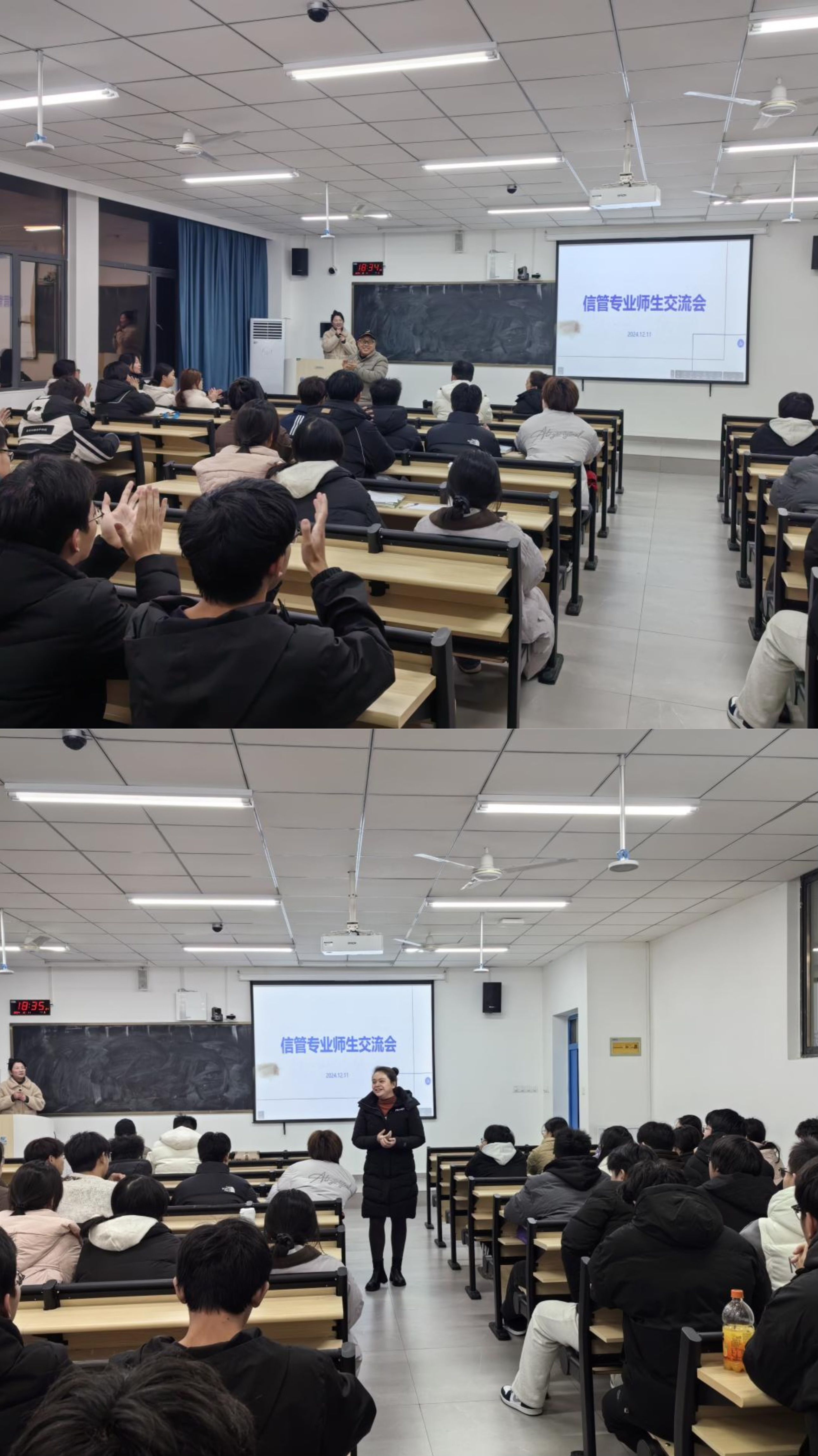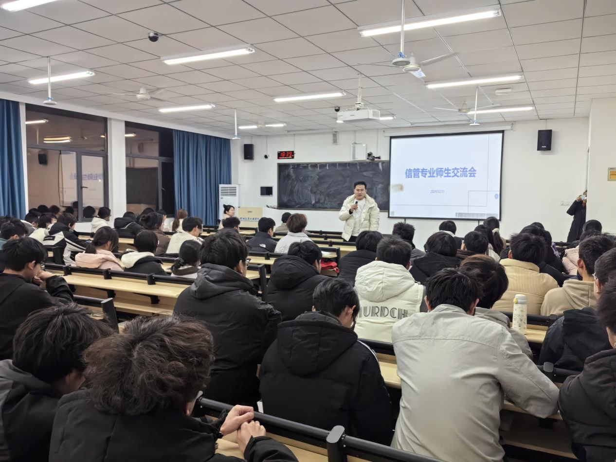 2024年12月11日晚在8206教室开展了信息管理与信息系统专业师生交流会。本次会议由信管系专业负责人郑珊珊老师主持,信管系陈延寿教授、程曾平副教授、信管系主任王红英副教授参加了此次活动。活动旨在解答员工关于专业发展的疑问,并探讨信管专业员工的未来方向。