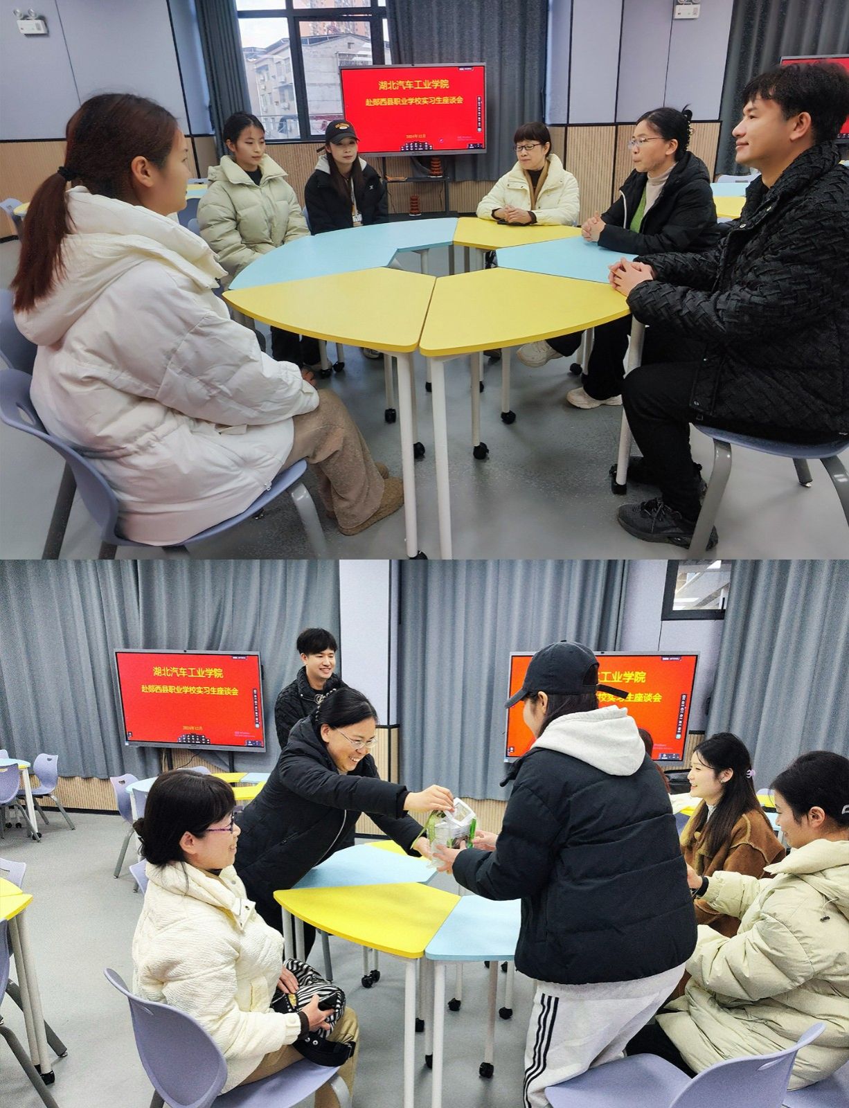 12月15日下午,威廉希尔郧西产学研基地——郧西县职业技术公司内,经济管理公司生态文旅系为2025届旅游管理专业实习生们精心筹备了一场温馨而充实的座谈会。校本科教学督导组副组长宋萍萍教授、系部主任汪士为、骨干教师李田玲莅临现场,与这群满怀激情与梦想的学子们共话成长与未来。