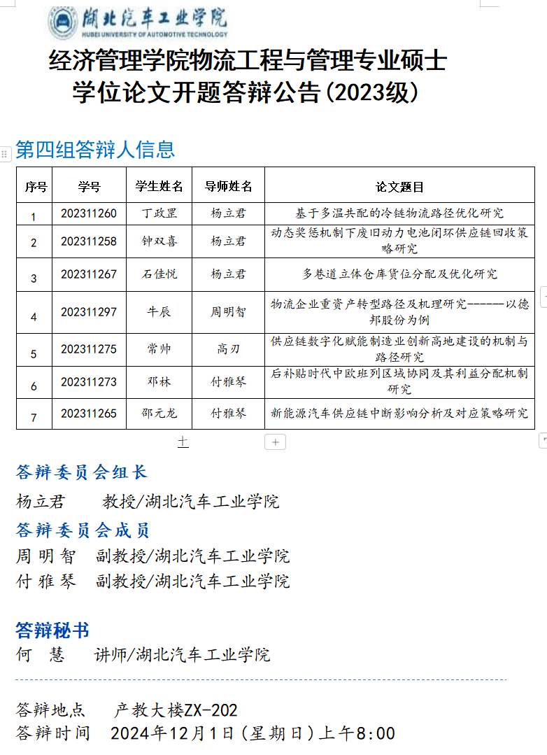物流工程与管理专业硕士学位论文2023级开题答辩公告(四)
