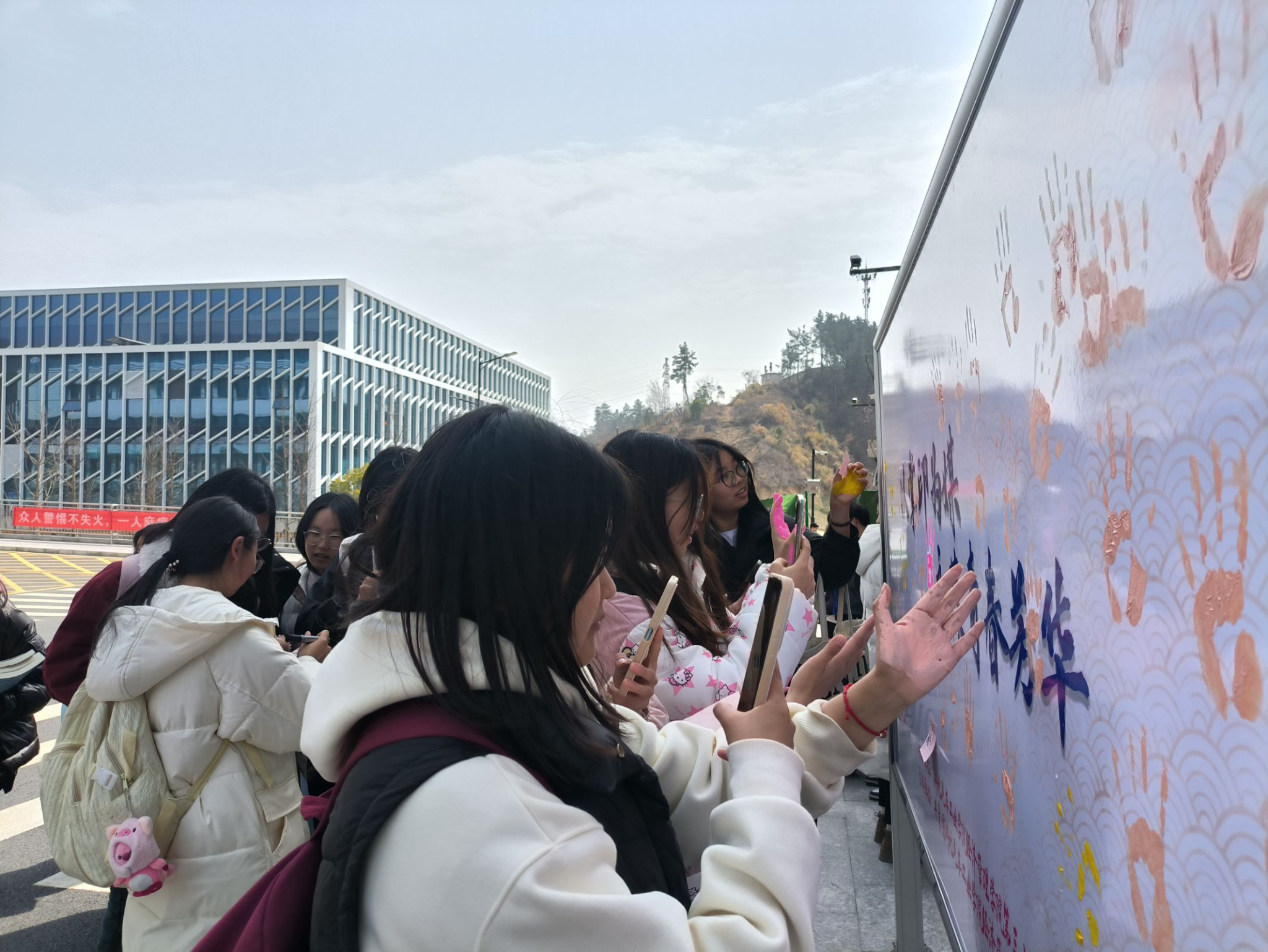 活动现场,女生们热情高涨,积极参与。她们以手为画笔,选择心仪的色彩,在画板上留下了属于自己独一无二的掌印,每一个掌印都代表着她们对青春的热爱与追求。五彩缤纷的掌印汇聚成一幅幅色彩斑斓的画卷,仿佛春天的来信,传递着生机与活力。同时,她们以标语传情,写下所思所感。“以梦为马,不负韶华”,“爱自己”,“大胆做自己”,“加油”…… 一句句充满激情而热烈的话语铺满在五彩缤纷的画板上,简短而精炼的话语充满着力量与对生活的热情,正是这样一句句话语与丰富多彩的掌印谱写了这次春日的来信。