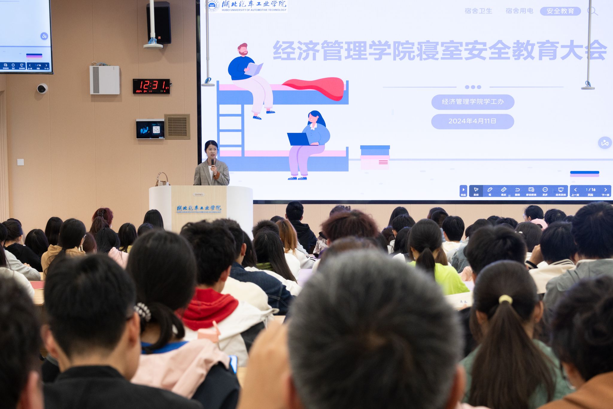 为引导员工有效防范各类安全事件,增强员工宿舍安全意识,加强平安校园建设,4月11日中午,经济管理公司分别在8106教室和6111教室召开寝室安全教育大会,大会由学工办主任张倩和辅导员王曼主持,各班班长和全体寝室长参加此次大会。