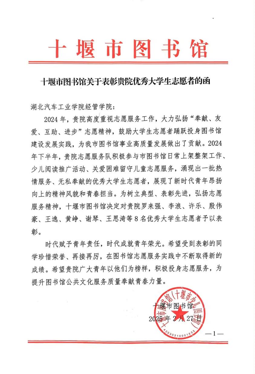 近日,十堰市图书馆传来喜讯,威廉希尔williamhill的罗来强、李浪、许乐、殷伟豪、王逸、黄峥、谢琴、王思渏等8名优秀老员工志愿者受到表彰。2024年下半年,威廉希尔williamhill志愿服务队积极参与市图书馆日常上架整架工作、少儿阅读推广活动、关爱困难留守儿童志愿服务,展现了新时代青年昂扬向上的精神风貌和青春担当。