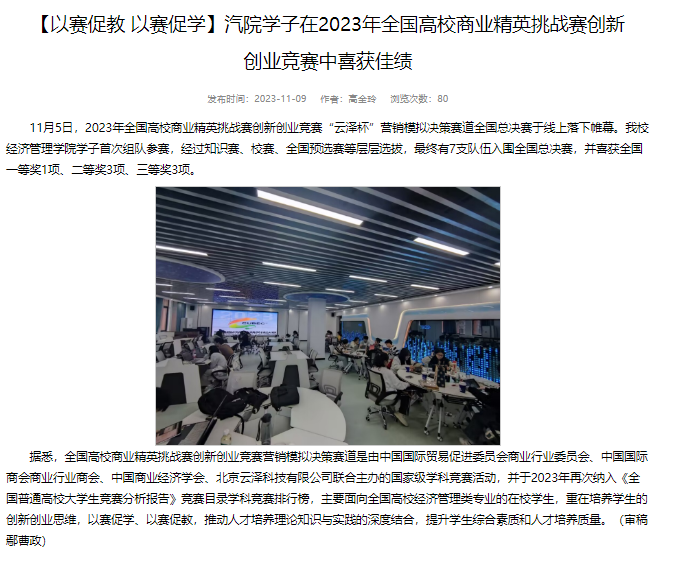 经济管理公司财务专业组织员工参加2023年全国高校商业精英挑战赛创新创业竞赛“云泽杯”营销模拟决策赛道全国总决赛于线上落下帷幕。公司经济管理公司学子首次组队参赛,经过知识赛、校赛、全国预选赛等层层选拔,最终有7支队伍入围全国总决赛,并喜获全国一等奖1项、二等奖3项、三等奖3项。
