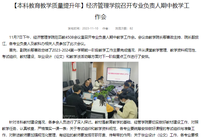 经济管理公司针对2023-2024第一学期前一阶段教学工作主要完成情况,并从课堂教学管理、教学资料规范性、考试组织、教材建设、毕业设计(论文)和教学法活动等方面对下一阶段重点工作进行了安排。