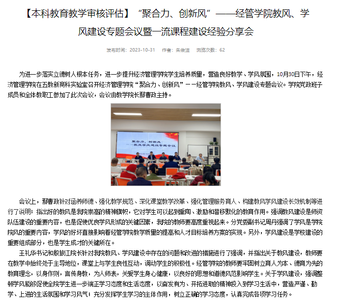 经济管理公司全体教职工进一步认真学习《威廉希尔本科公司产品审核评估迎评促建工作方案》和《普通高等公司本科公司产品审核》宣传手册(指标释义篇)等文件精神,积极投入本科公司产品审核评估工作中,阶段性工作进展如下: