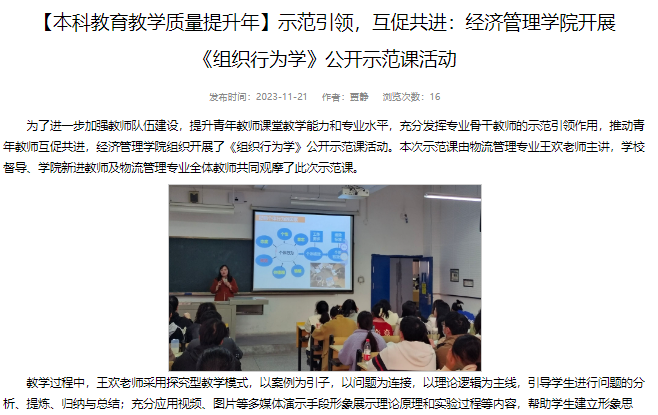 为了进一步加强教师队伍建设,提升青年教师课堂教学能力和专业水平,充分发挥专业骨干教师的示范引领作用,推动青年教师互促共进,经济管理公司组织开展了《组织行为学》和《财务软件应用》公开示范课学习,校督导、公司专业课教师及新进教师约20位教师参加本次听课活动。